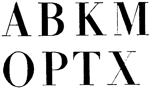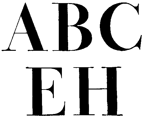 Наконец, возникает целая семья шрифтов гротескных, или древних, в которых вовсе нет засечек, а контрастность основного и дополнительного штрихов или вообще отсутствует, или очень слаба, почти незаметна. В начертании некоторых из них возрождались особенности шрифта древнегреческих надписей. Позднее они послужили основой для таких популярных в наше время шрифтов, как рубленые.
