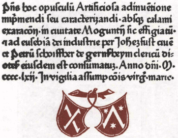 Впервые «фирменным» знаком были помечены Псалтырь 1457 г. и Библия 1462 г. Это сигнет Фуста и Шёффера − два свисающих с ветвей щита с геральдическими знаками. Обычай этот вскоре стал всеобщим. Каталоги издательских знаков также часто помогают определить типографа, если книга издана без выходных данных.
