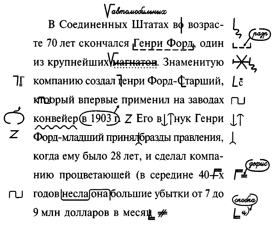 Для наглядности ниже приводится отрывок публицистического текста, исправленного с помощью вышеприведённых знаков.