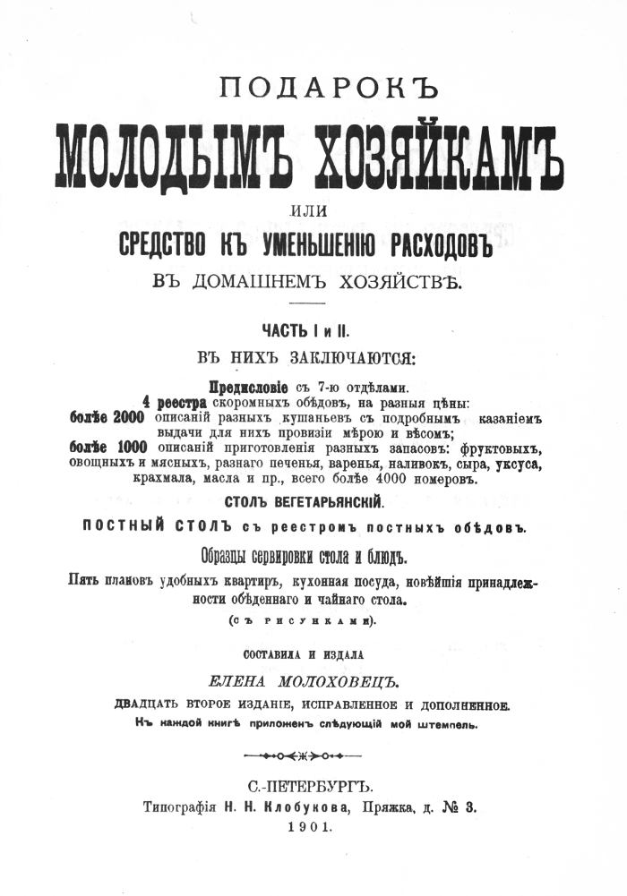 Замечательная книга кулинарных рецептов Елены Молоховец, изданная в 1901 году. И, несмотря на то, что она многократно переиздавалась, книга остается библиографической редкостью. Книга дает представление не только о рецептах того времени, но и о способах ведения домашнего хозяйства, покупок продуктов и делания запасов. Ведь холодильников тогда не было.
